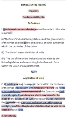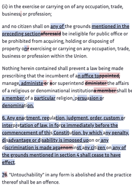 In the Advisory Subcommittee on Fundamental Rights, the committee took up a draft on the subject introduced by K.M. Munshi. As is typical parliamentary procedure, the committee severally considered the clauses, amending and voting on each one. From this clause-by-clause treatment of the document resulted an amended version of the text, shown in the left-hand images below, that was to be reported to the Constituent Assembly.
