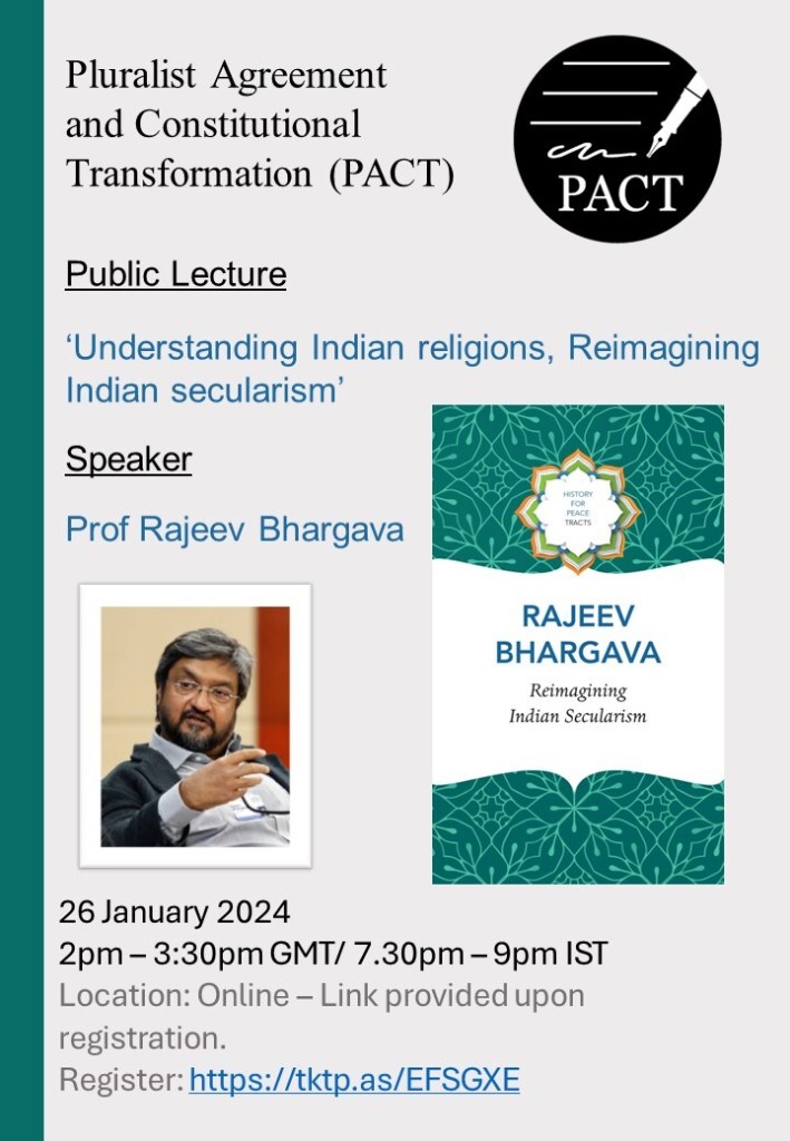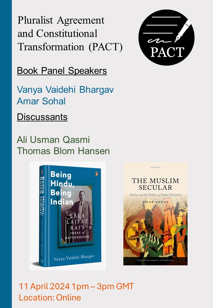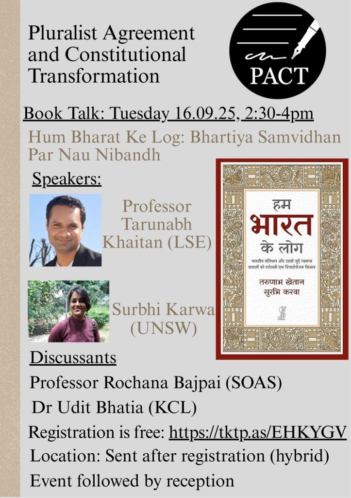 16 Sept 2025: The PACT project hosted a Book Talk by Professor Tarunabh Khaitan (LSE) and Surbhi Karwa (UNSW) on their book Hum Bharat Ke Log: Bharatiya Samvidhan par Nau Nibandh at SOAS. The event was attended by 40 people, both online and in person. Professor Rochana Bajpai (SOAS) and Dr Udit Bhatia (KCL) served as panel discussants. The event was followed by a reception and a tour of the Exhibition After the Assembly: Constituting India at the SOAS Gallery.