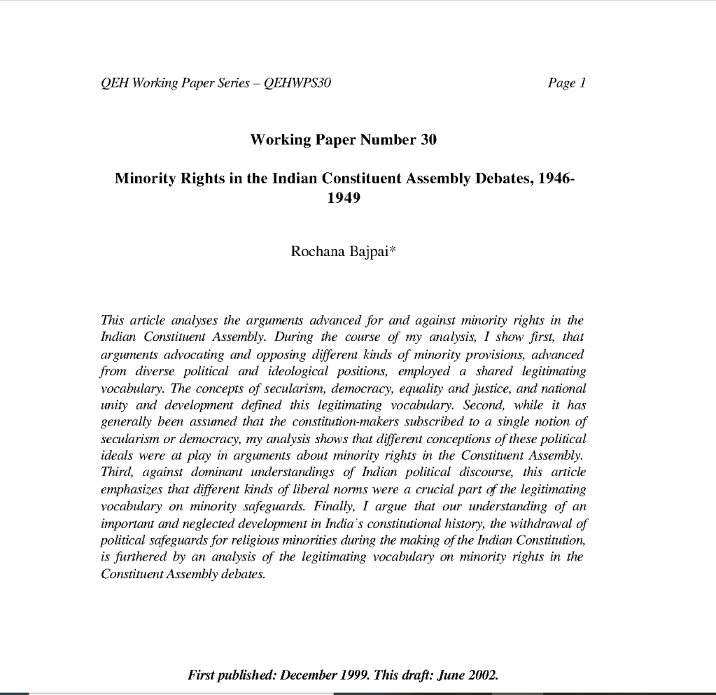 Bajpai, Rochana. 2002b. “Minority Rights in the Indian Constituent Assembly Debates 1946-1950.” Working Paper No. 30. Oxford Department of International Development.