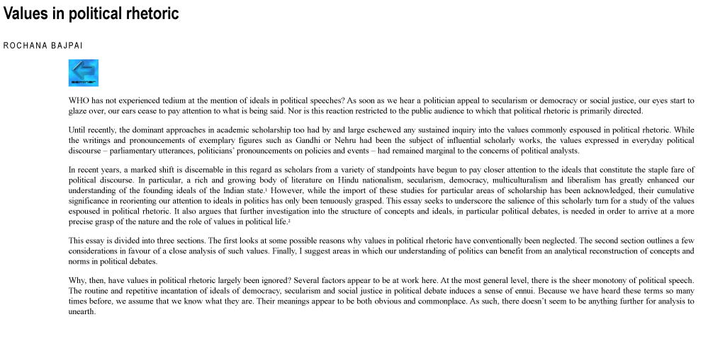 Bajpai, Rochana. 2003. “Values in Political Rhetoric.” Seminar (524).