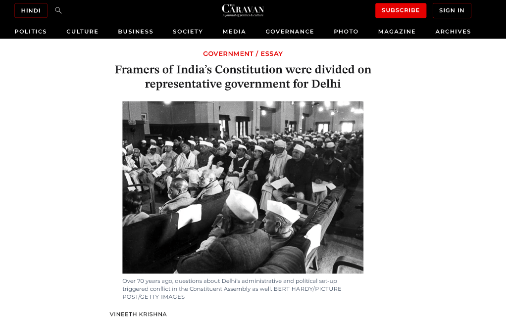 Krishna, Vineeth. 2018a. “Framers of India’s Constitution were divided on representative government for Delhi.“ Caravan Magazine.